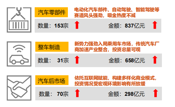 汽车零部件领域作为热门赛道持续吸引各方投资者的关注。汽车零部件领域的交易数量占同期交易数量的6成,达153笔;交易金额占同期交易金额的近5成,达837亿元。