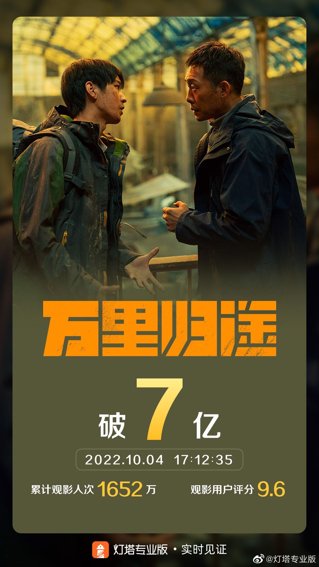 据@灯塔专业版 微博消息,截至10月4日17时12分,影片《万里归途》票房突破7亿。