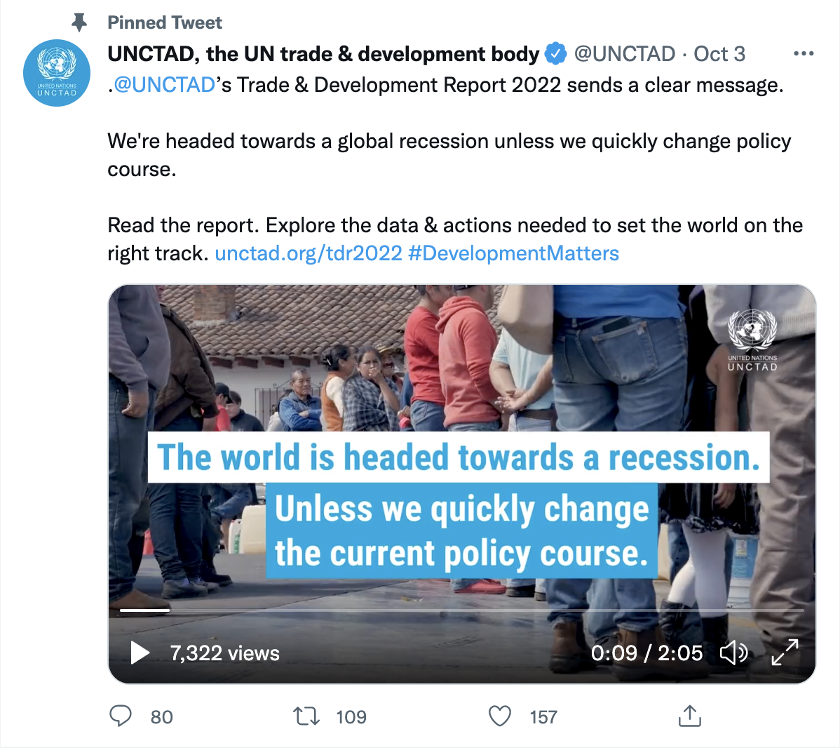 联合国贸易和发展会议(UNCTAD)在其10月3日发布的《2022年贸易和发展报告》指出,发达经济体的货币和财政政策,比如持续加息,可能会将全球推向经济衰退和停滞。