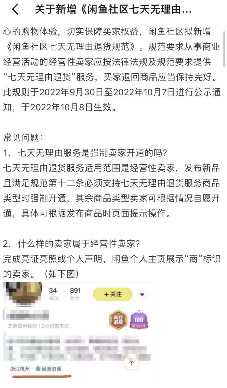闲鱼App显示,闲鱼社区拟新增《闲鱼社区七天无理由退货规范》。规范要求从事商业经营活动的经营性卖家应按法律法规及规范要求提供“七天无理由退货”服务,买家退回商品应当保持完好。此规则于2022年9月30日至2022年10月7日进行公示通知,于2022年10月8日生效。