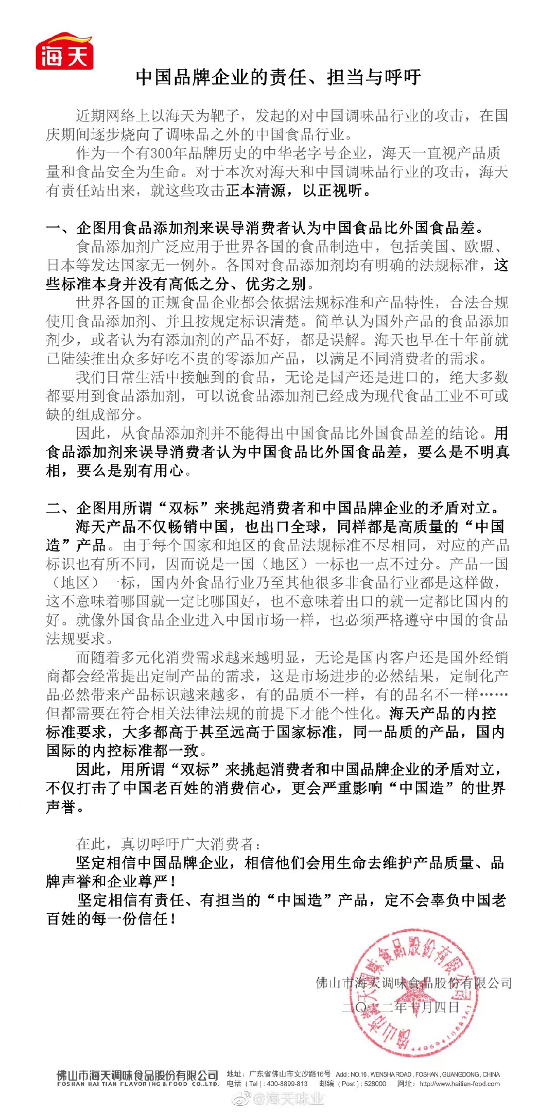 国庆长假过去5天,调味品上市公司海天味业(603288.SH)发了两份声明。