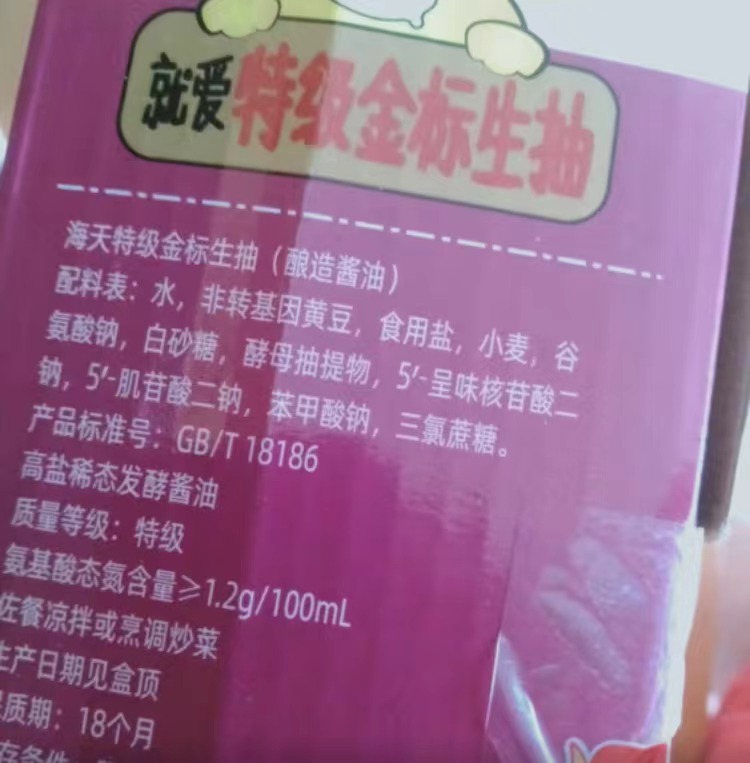 界面新闻注意到,10月5日,微博ID为“李三金Alex”的博主在美国湾区的一家超市专门拍摄了海天酱油的配料表,其中海天金标生抽(1.75升)的配料表包括:水、大豆、食用盐、小麦、谷氨酸钠、白砂糖、大米、酵母提取物、5'-呈味核苷酸二钠、5'-肌苷酸二钠、防腐剂(苯甲酸钠)、三氯蔗糖。