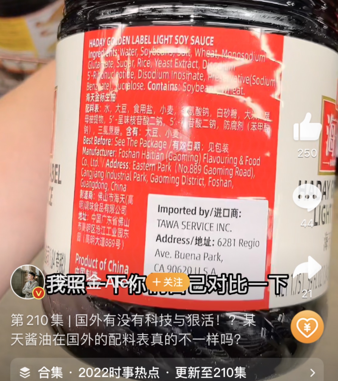 让海天味业如此紧张的,是一条“海克斯科技”话题在抖音、小红书等短视频平台发酵的话题——“海克斯科技”,本是游戏用语,指魔法与科技的融合技术,后延伸到食品领域,多指使用食品添加剂制作的食物。有短视频博主称,海天味业的酱油是“海克斯科技食品”,因为海天国内售卖的海天酱油含食品添加剂,而国外售卖的海天酱油零添加,只有水、大豆、小麦、食盐等,其产品存在双标。