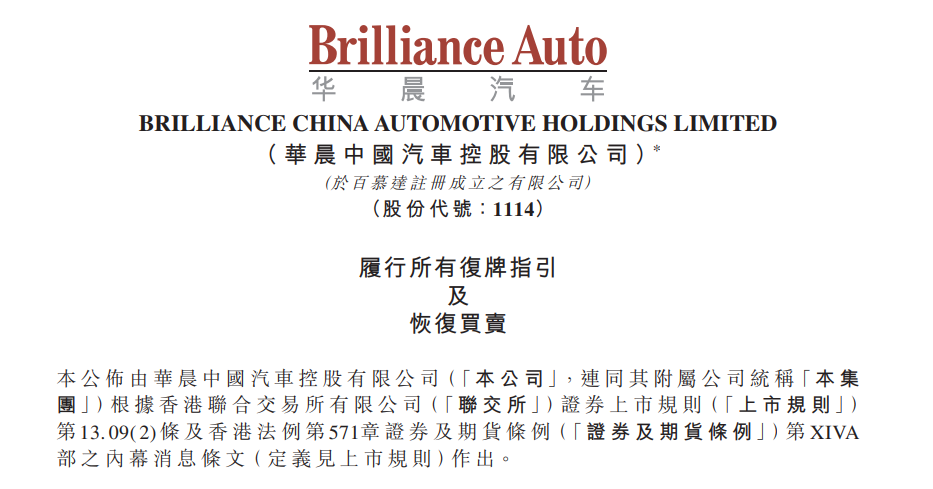 10月3日,华晨中国发布公告称,公司已履行所有复牌指引。在股份恢复买卖后,华晨中国将继续与港交所合作,协助调查违反上市规则的情况。华晨中国表示,公司已整改导致暂停买卖的事宜。