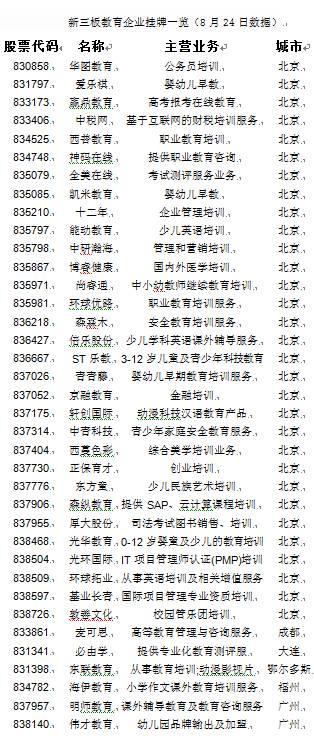 据东财Choice统计,按照管理型行业分类,截至8月24日,新三板上纯教育类企业只有57家,详见下表: