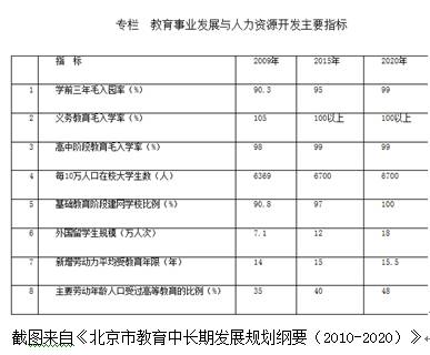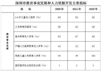 可以看出,就学前教育入园率、义务教育巩固率、高中教育毛入学率来看,深圳市在2015年要达到的目标分别为95%、95%和97%,而北京分别为95%、100%以上和99%。见下表: