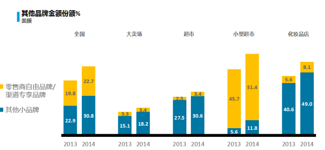 其次,微商面膜崛起,同时伴随种种质疑。小型化专业渠道带动面膜增长,但大卖场超市最近有所恢复。其他品牌在小型专业渠道占比更高;小型超市中零售商自有品牌及渠道专享品牌份额超过一半。贵价产品在化妆品店占比更高。低级别城市拉动增长,且渗透空间巨大。西部地区虽然占比较小,但增长可观,渗透加深。