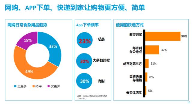 此外,无论是去实体店还是去网店,还是app下单,消费者希望以更少的时间买到更好质量商品。消费者网购日常食杂用品的态度中,有33%消费者认为会买更多,接近一半的消费者持平的态度,18%消费者认为会买更少。同时,30%以上消费者总是使用APP下单,90%以上消费者选择邮寄到家,37%选择邮寄到办公地点。