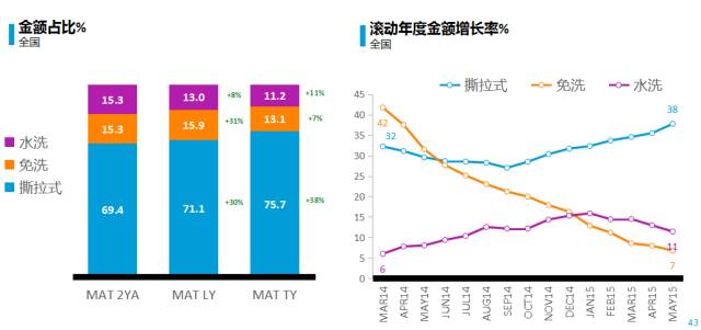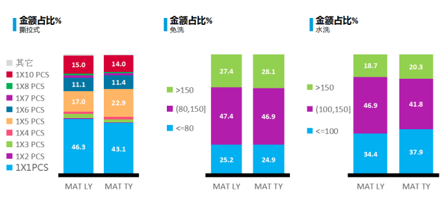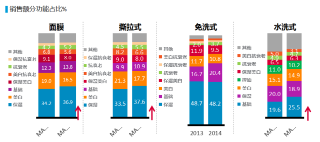 从产品上看,撕拉式面膜仍将引领增长,且撕拉式面膜以中低价位段为主。面膜多片装撕拉式面膜增长良好。保湿是面膜最主要的功能,且增长快速,主要来自撕拉膜及水洗面膜。面膜形态多样,创新形态层出不穷,加入竹炭纤维的黑面膜成为市场热门。玻尿酸面膜主打保湿功能,近来也成为市场热门。