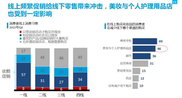 产品有生命周期,渠道也有生命周期。尽管全年增长较快,美妆与个人护理用品店的增长从2015年下半年开始放缓,2015年10月开始下降趋势较为明显。此外,线上频繁促销给线下零售带来冲击,美妆与个人护理用品店也受到一定影响,多数消费者认为有促销活动时会选择多买以囤货。即便多数购物者在线下也会购买同样的产品,但他们可能会受到宣传的吸引而选择网上购买。