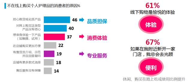 品质担保、消费体验和专业服务,是美妆与个人护理用品店吸引消费者的重要优势,同时,体验和便利性被认为是线下渠道最大的优势。在这一趋势下,新产品和消费升级成为个人护理产品增长的关键推动因素。美妆与个人护理用品店吸引较多的是单价偏低的洗面奶和爽肤水,而面霜和面膜购物者则倾向于线上购买。