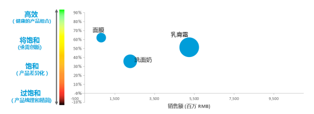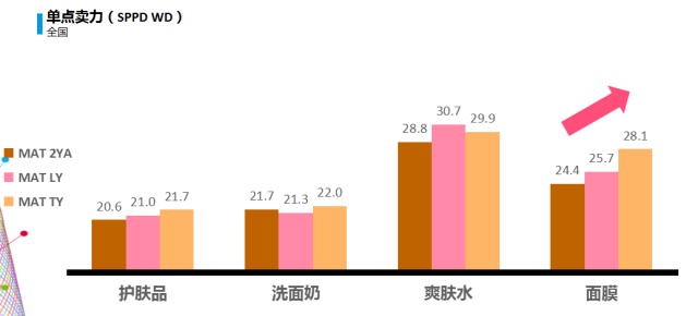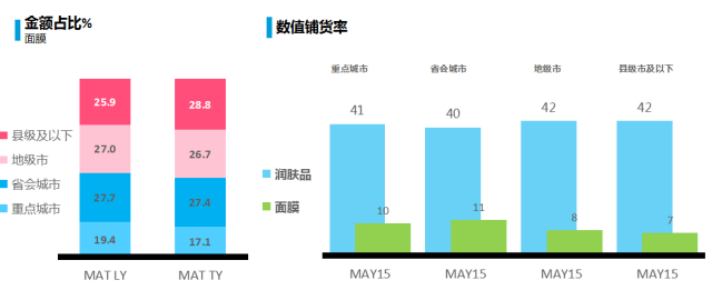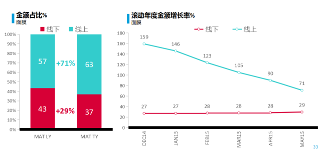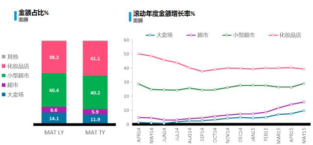从渠道上看,面膜区域和渠道发展趋势正在向上、向小、向下、向西发展。向上,是指电商渠道发展迅速;向小指小型专业化渠道带动增长;向下指低级别城市增长驱动;向西指西部区域潜力巨大。从线上线下来看,面膜品类线上增速虽呈放缓趋势,但依然快于线下。