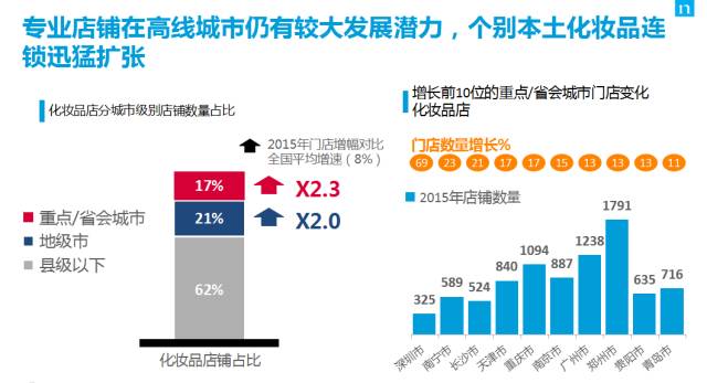 以化妆品店为例,最近几年化妆品专营店增长速度很快。在重点省会城市,2015年门店数占比达17%,地级市占21%,县级以下占比62%。消费者对连锁化的需求越来越高,也导致本土化妆品店数量增长越来越快。化妆品店增长前10位的重点省会城市依次是深圳、南宁、长沙、天津、重庆、南京、广州、郑州、贵阳、青岛。