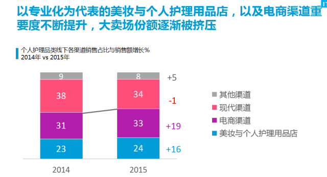绝大多数消费者都拥有多渠道消费习惯,但以专业化为代表的美妆与个人护理用品店、电商渠道的重要度不断提升,传统大卖场份额逐渐被挤压。从2015年与2014年的数据对来看,美妆与个人护理用品店渠道份额占比24%,比2015年增长1%,同时销售额增长16%。电商渠道增长最大,整体销售额增长了19%,现代渠道和其他渠道份额则在萎缩。