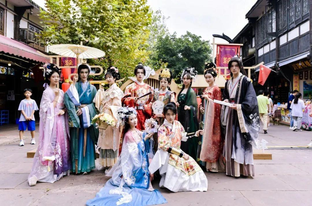 在西来古镇,国庆期间,一场以“汉韵迎国庆”为主题的汉服祈福活动在此举行,向游客展示了汉服文化的魅力。与此同时,古镇街头进行的中国古彩戏法表演亦引人注目,让市民和游客尽情徜徉在节日的氛围中。