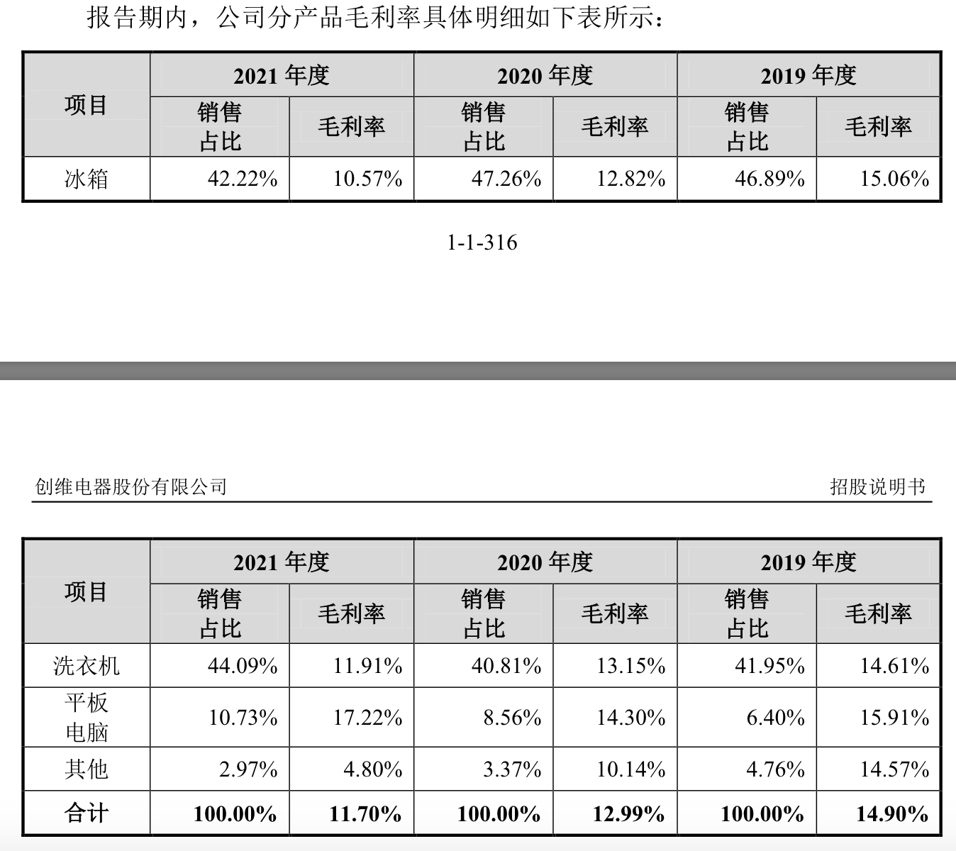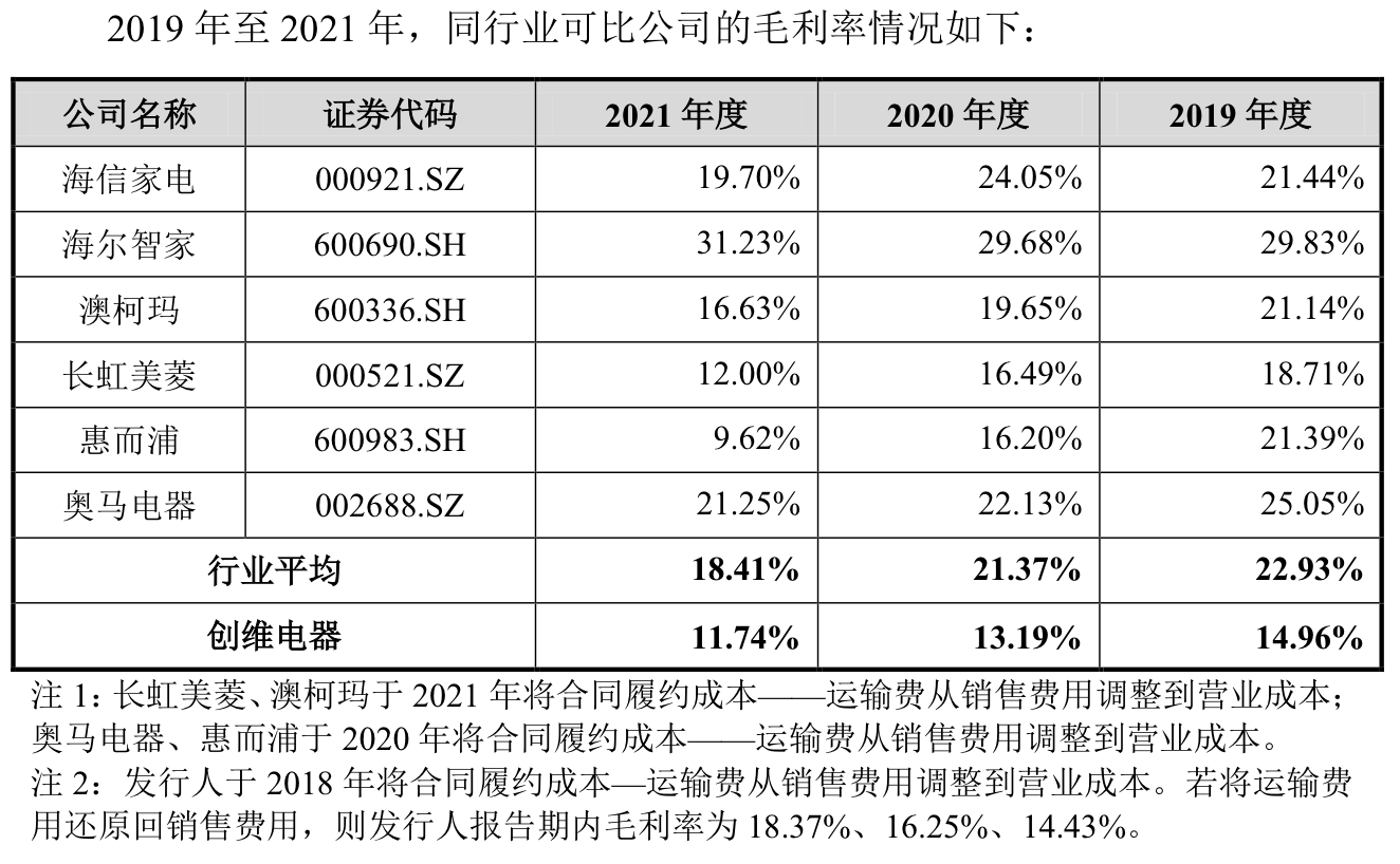 数据显示,创维电器2019年至2021年的营业收入分别为36.85亿元、37.39亿元、40.02亿元,归母净利润分别为1.69亿元、1.4亿元、1.24亿元,毛利率分别为11.74%、13.19%、14.96%。相比之下,可比公司海信家电(000921.SZ)、海尔智家(600690.SH)、澳柯玛(600336.SH)、长虹美菱(000521.SZ)、惠而浦(600983.SH)、奥马电器(002688.SZ)等平均毛利率分别为22.93%、21.37%、18.41%,创维电器与之差了一大截。
