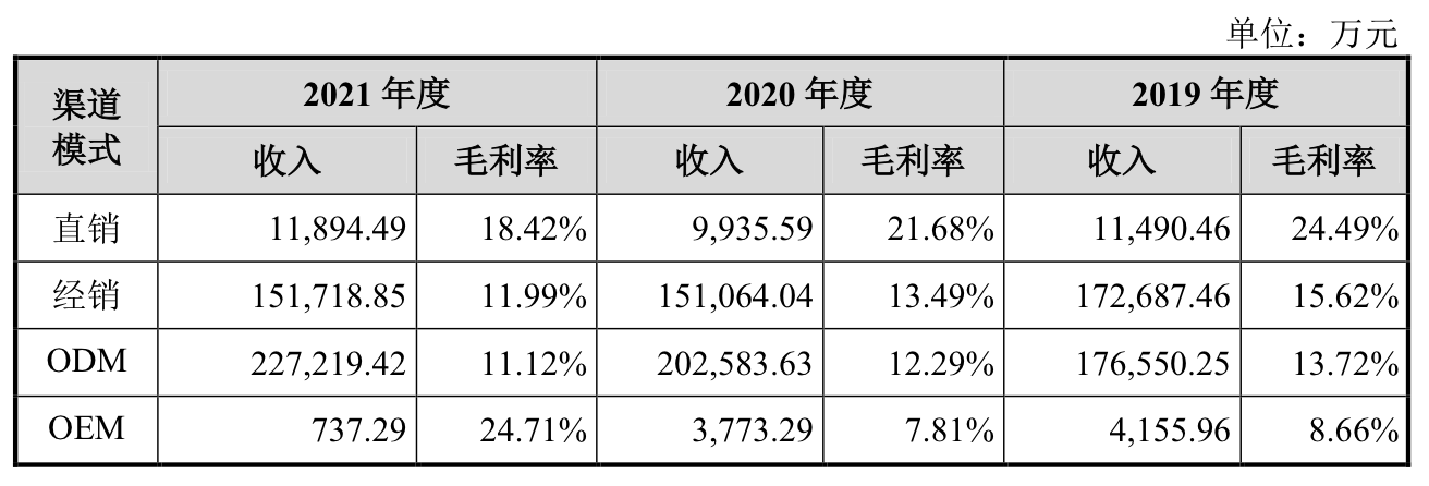 对此,创维电器给出的解释是,公司ODM/OEM业务收入占比较高,2019年至2021年比例分别为49.53%、56.18%、58.22%,这也直接拉低了公司的综合毛利率。
