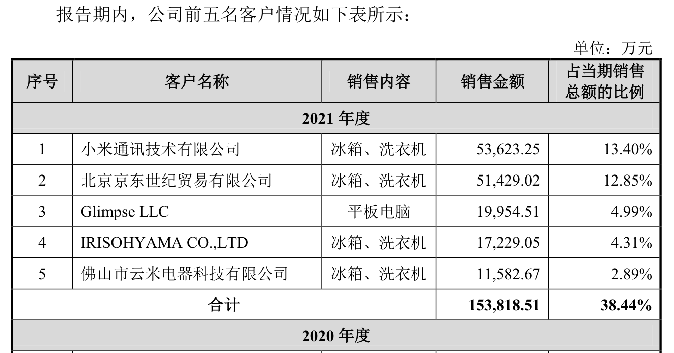 创维电器2021年前五客户就分别是小米通讯技术有限公司、北京京东世纪贸易有限公司、Glimpse LLC、IRISOHYAMA CO.,LTD、佛山市云米电器科技有限公司,5者合计的销售金额高达15.38亿元,占总数的38.44%。