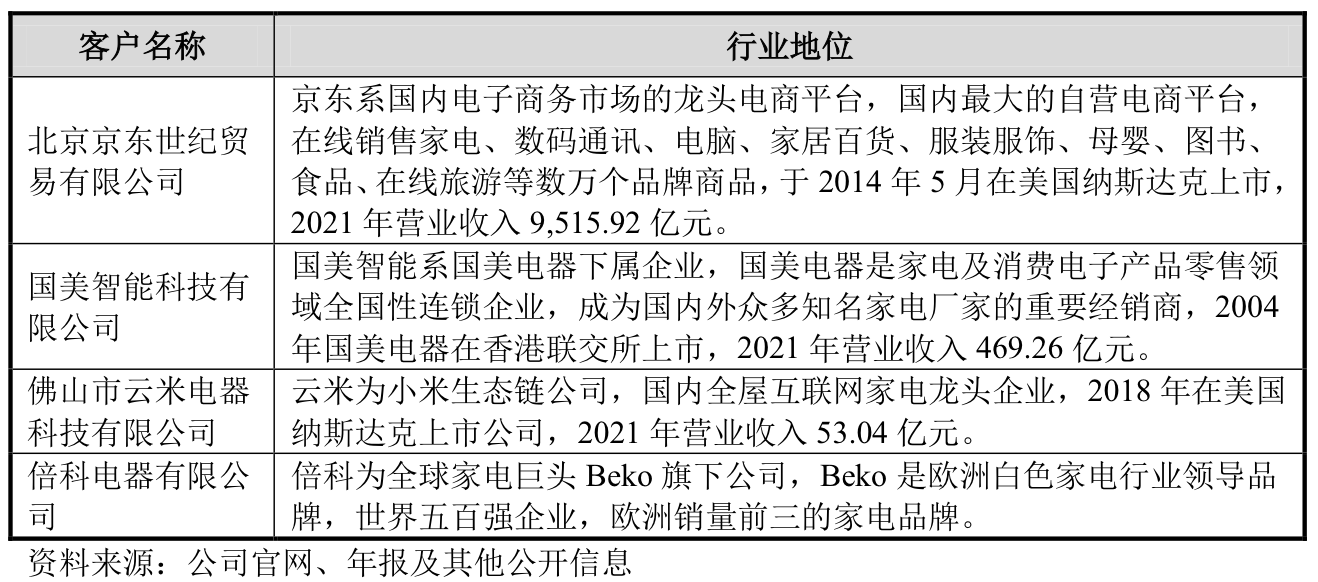 根据说明书,ODM的客户为小米、云米、国美、倍科电器等,也有IRISOHYAMA CO.,LTD、Glimpse LLC等国际公司,OEM模式重要客户如上海易教、好成绩网络。