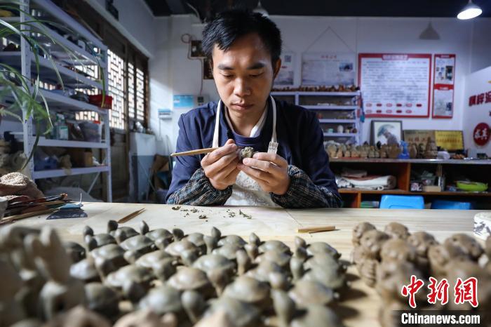 7日,在贵州省遵义市桐梓县桐梓记忆商业街的一间工坊里,34岁的桐梓县非物质文化遗产桐梓泥哨制作技艺传承人姚德波正在精心制作“十二生肖”系列的泥哨作品。