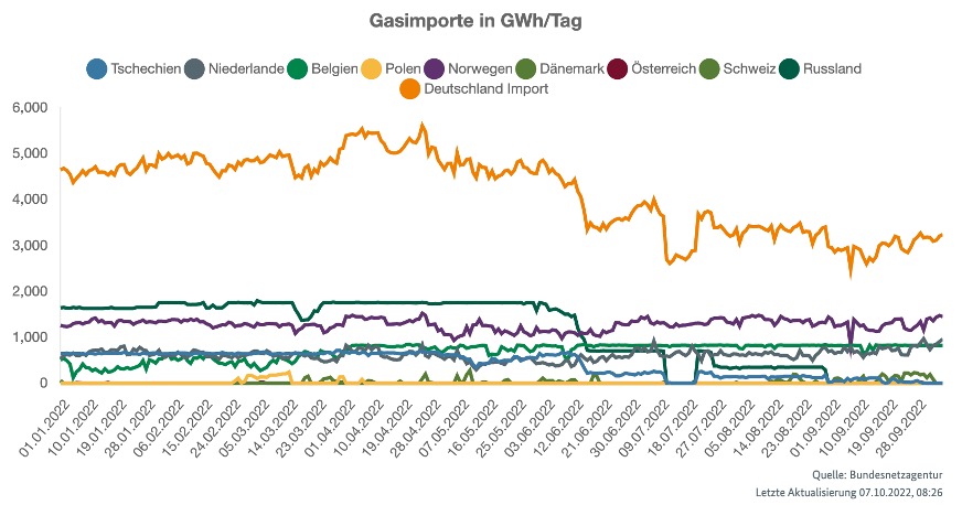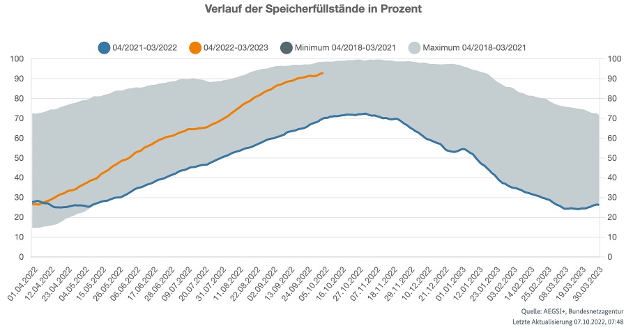 根据德国网络署的数据,截至10月7日的天然气库存水平已经超过92%,远高于去年同期约70%的库存量,也已超额完成了柏林政府制定的10月1日之前储气85%的目标。按网络署的计算,目前库存足以确保德国在一切天然气进口皆中断的情况下覆盖近三个月的用气需求,按过往取暖季的消耗计算,目前的储气量足以确保至明年2月末的需求。