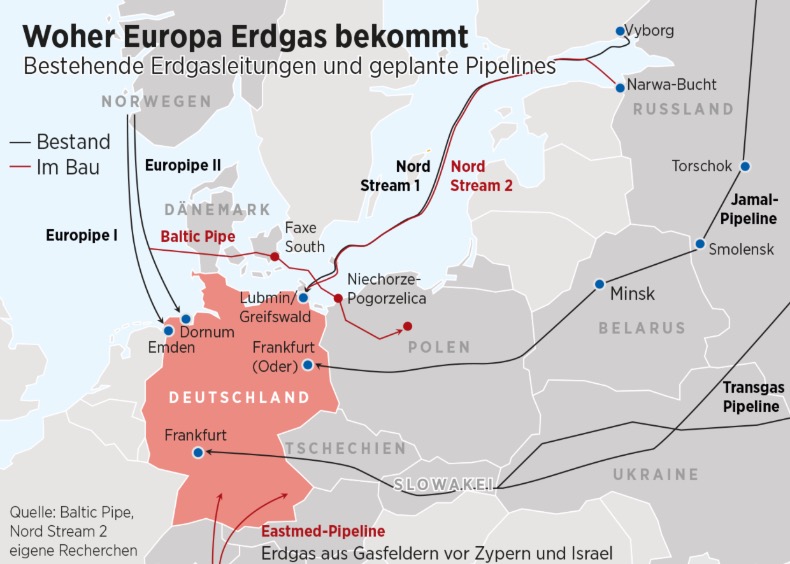 德国能源政策的短视以及其地理位置也是造成天然气危机的原因。一方面,位居欧洲大陆中央的德国天然气管道网向西通过荷兰之间与北海油气田相连,向东通过亚马尔管道与西西伯利亚大气田连接,向北通过北溪1号和2号与俄罗斯本土直接连通。过于发达的管网和廉价的管道气使得德国政府从未计划修建液化天然气再气化设施,因此美国和中东的液化天然气无法直接运抵德国本土,而必须在波兰或法国中转。另一方面,德国南方阿尔卑斯山阻挡了该国管网与南欧网络的整合,南欧较为富裕的液化天然气再气化设施也因此无法被德国使用。