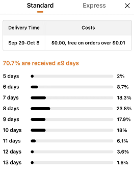 Temu的平均配送天数是8到9天,70.7%的商品会在9天内完成配送。前三单免运费,3单之后满29美元免运费。