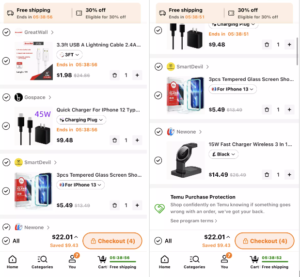 在Shawn的首份购物清单中,电子产品配件占了大头,包括手机屏幕保护膜、数据线、无线座充和充电宝。使用平台优惠券后,这一单的总价为22.01美元。