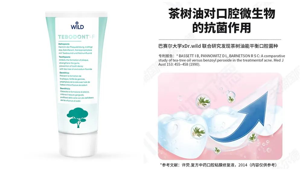 据其产品详情页宣称,Dr.Wild怀尔德与瑞士巴赛尔大学联合研究发现,茶树油可以有效平衡口腔菌种,使口腔内的有害菌活性降低。