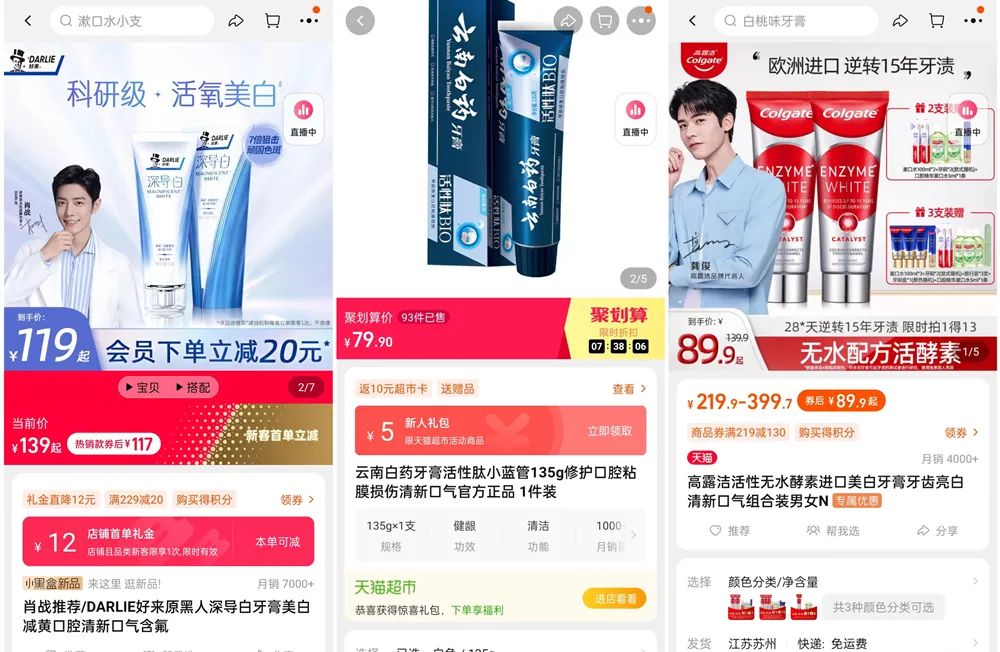 比如,DARLIE好来(注:原名“黑人”)推出的深导白牙膏,宣称采用了活氧美白技术,“4周使牙齿美白效果提升3个色阶”,该产品售价117元/100g;云南白药活性肽小蓝管,主打修护口腔黏膜,售价约79元/135g;高露洁无水酵素美白牙膏,宣称用于去烟渍、去牙渍,售价89元/101g。