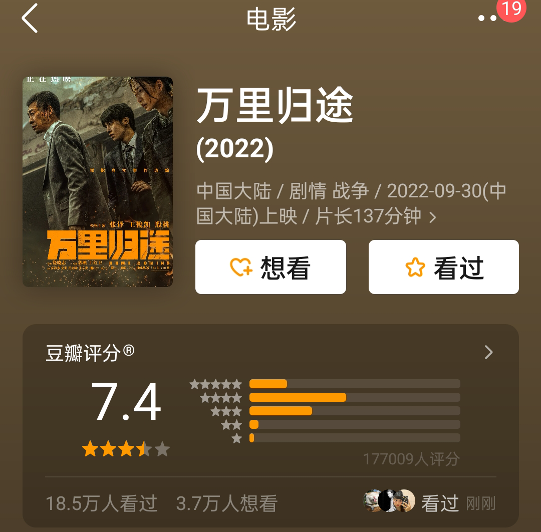 然而9月27日《长空之王》宣布撤档,让本就受疫情反复影响的国庆档失去票房主力,《万里归途》成为唯一具有“爆款”潜质影片,揽下十多亿票房,在豆瓣也获得7.4的不错分数。