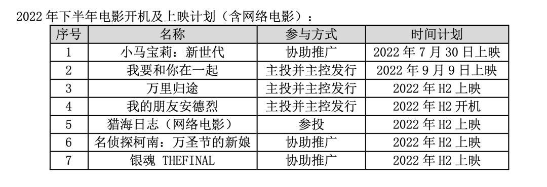 另外,报告期内公司有两部电影《寻秦记》《燃冬》已进入后期制作,在豆瓣上标注暂定上映时间为2022,但均未在公司财报披露的上映计划中。