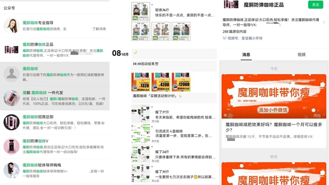 但在微信等公开渠道搜索“魔胴咖啡”,则成了“减肥”的代名词,一盒保守轻体2-4斤,4盒保守轻体5-15斤,15盒轻体20-40斤,且不用节食和运动。