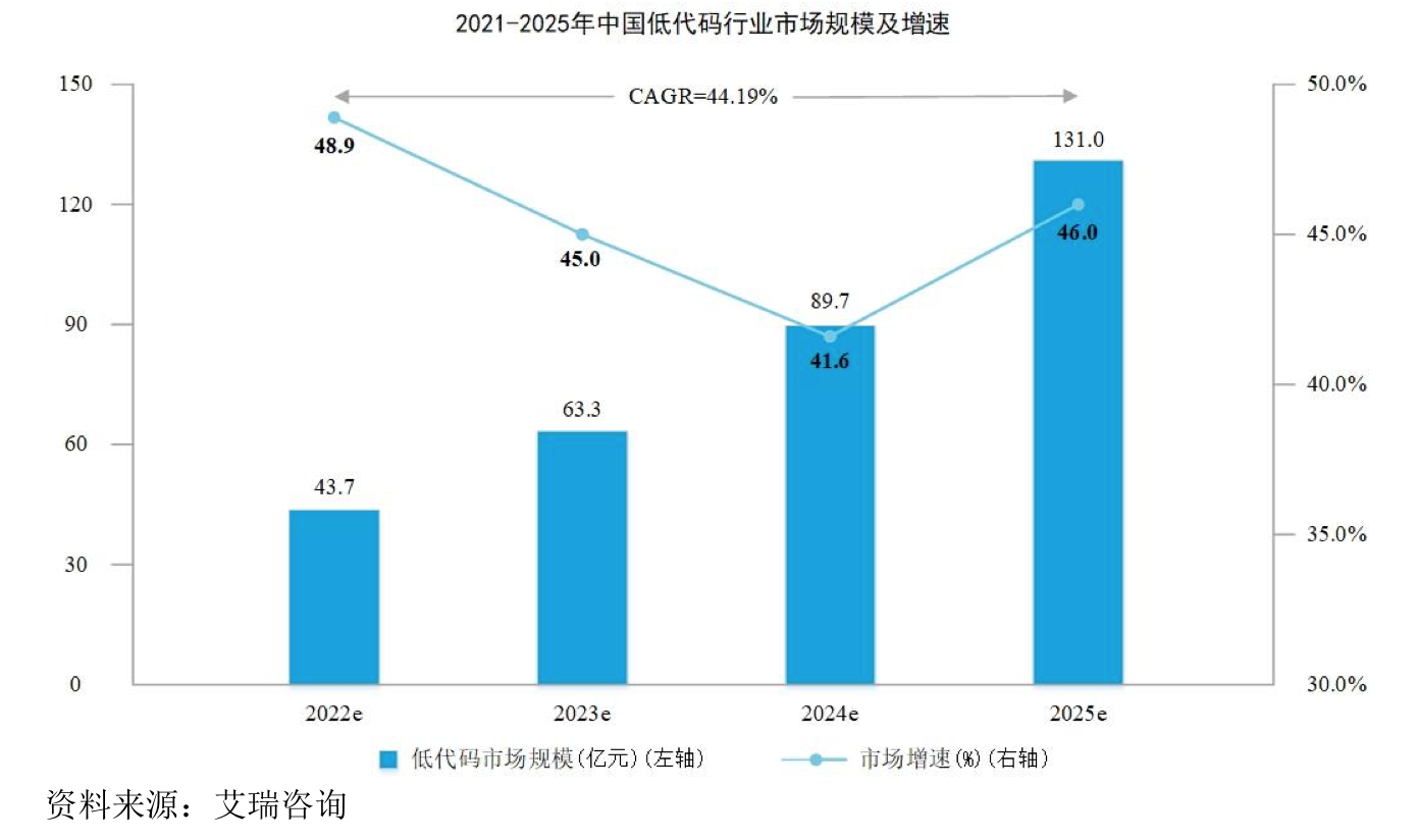 根据艾瑞咨询发布的《2021年低代码行业研究报告》,仅统计厂商对外提供 低代码开发平台并产生收入的细分市场,预计2022年国内低代码市场约为43.7亿元。未来随着低代码技术的成熟及行业经验的积累,预计2025年市场规模将达到131亿元,2022年至2025年行业规模的复合增长率将达到44.19%。