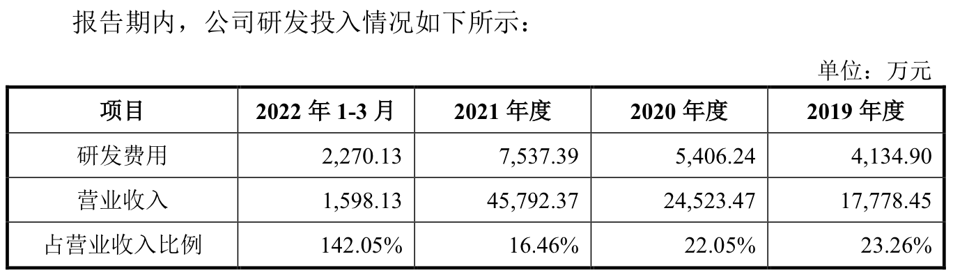 另外,这家公司2021年的研发费用达到了7537.39万元。由于2022年第一季度基数低的缘故,第一季度2270.13万元的研发投入,甚至占当期营业收入比例的142.05%。