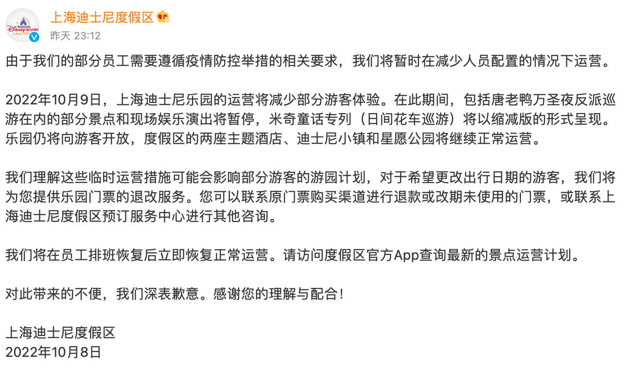 10月8日晚间,@上海迪士尼度假区 发文称,由于部分员工需要遵循疫情防控举措的相关要求,将暂时在减少人员配置的情况下运营。