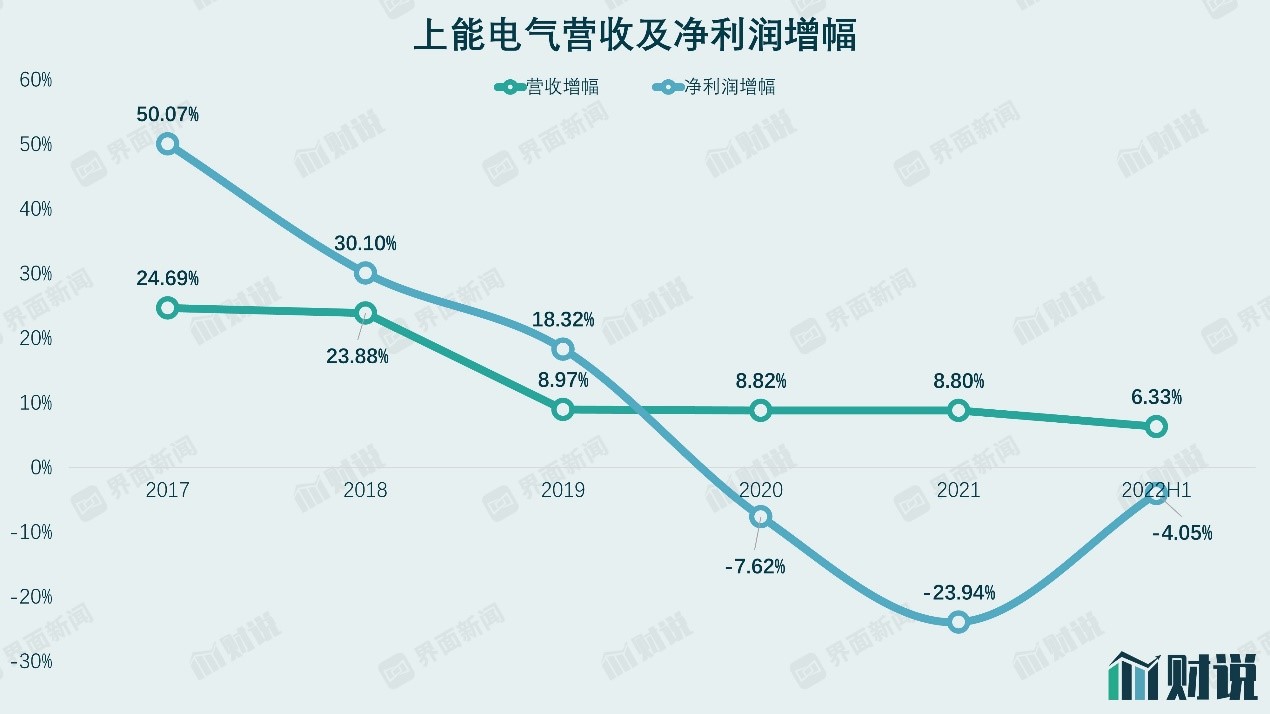 从数据上看,上能电气呈现出明显的上市即巅峰情况。自2020年上市以来,公司年年营收增幅为个位数,净利润则连续2年下滑。这与上市之前利润动辄两位数增长的表现截然相反。