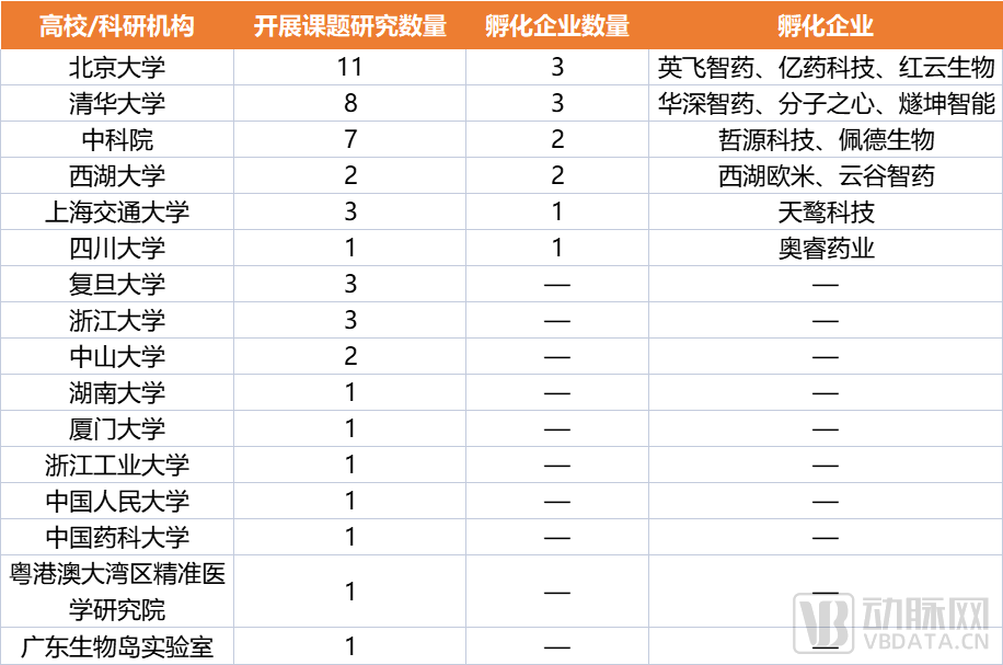 其中,北京大学开展了11个AI+新药相关的课题研究,孵化出了包括英飞智药、红云生物、亿药科技等3家AI+新药企业;清华大学开展了8个AI+新药相关的课题研究,孵化出了包括华深智药、分子之心、燧坤智能等3家AI+新药企业。