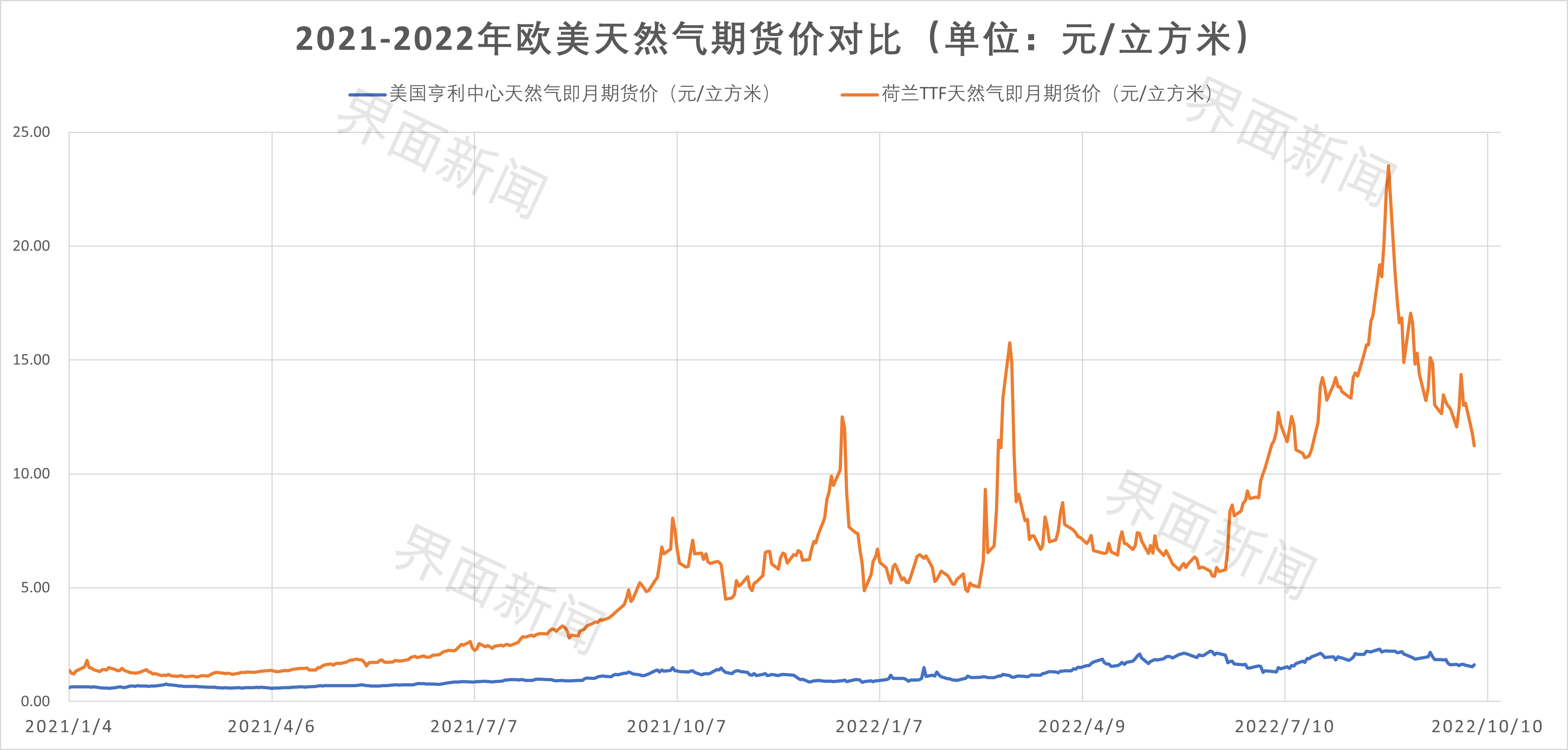 相较而言,欧洲天然气基准价荷兰TTF的期货价格从2021年起就不断上扬,在今年3月和8月创下了历史最高纪录的结算价。当地时间8月26日,该基准价的结算价为339.2欧元/兆瓦时(约合人民币23.5元/立方米)。