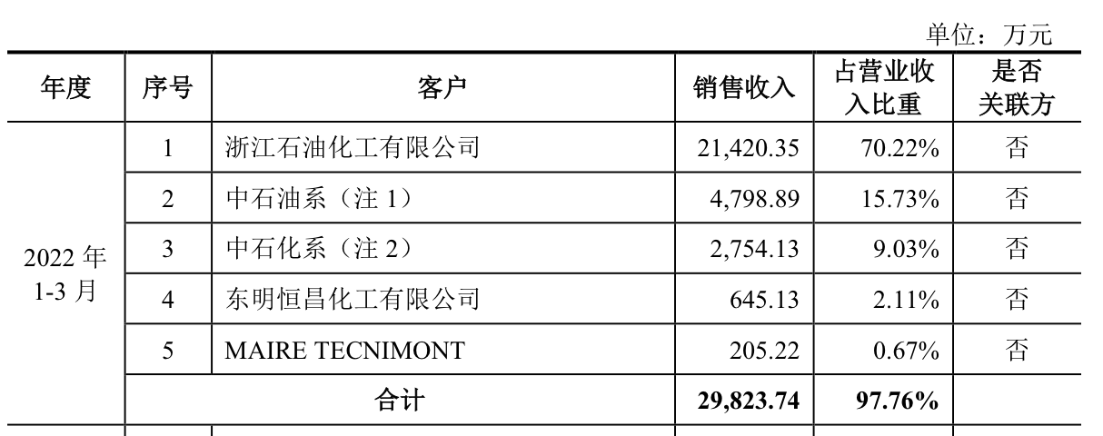 2022年第一季度,公司的前五客户就已经实现了2.98亿元的销售收入,占到了全部营业收入的97.76%。