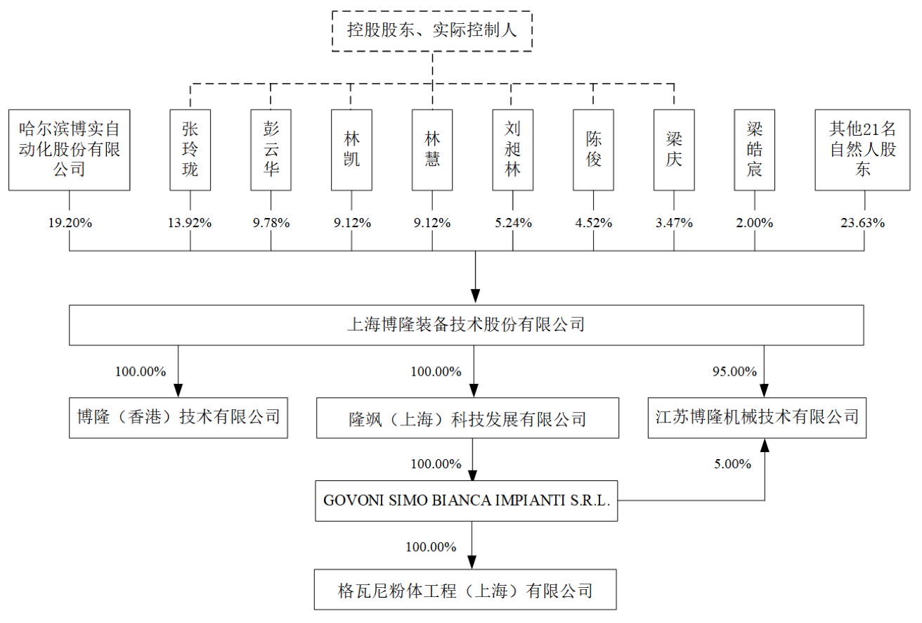 博隆技术的控股股东、实际控制人系张玲珑、彭云华、林凯、林慧、刘昶林、陈俊及梁庆,相关方合计持有公司5.17%的股权,控制公司76.37%的表决权。而博隆技术的第一大股东为上市公司博实股份,博实股份的持股比例为19.2%。