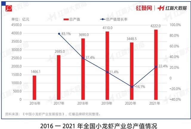 据全国水产技术推广总站、中国水产学会、中国水产流通与加工协会联合编写的《中国小龙虾产业发展报告(2022)》所述,2021年我国小龙虾产业总产值约为 4222 亿元,同比增长22.4%,超过了2019年疫情暴发前的水平。总之小龙虾产业的基本面较好,依然在稳定增长。