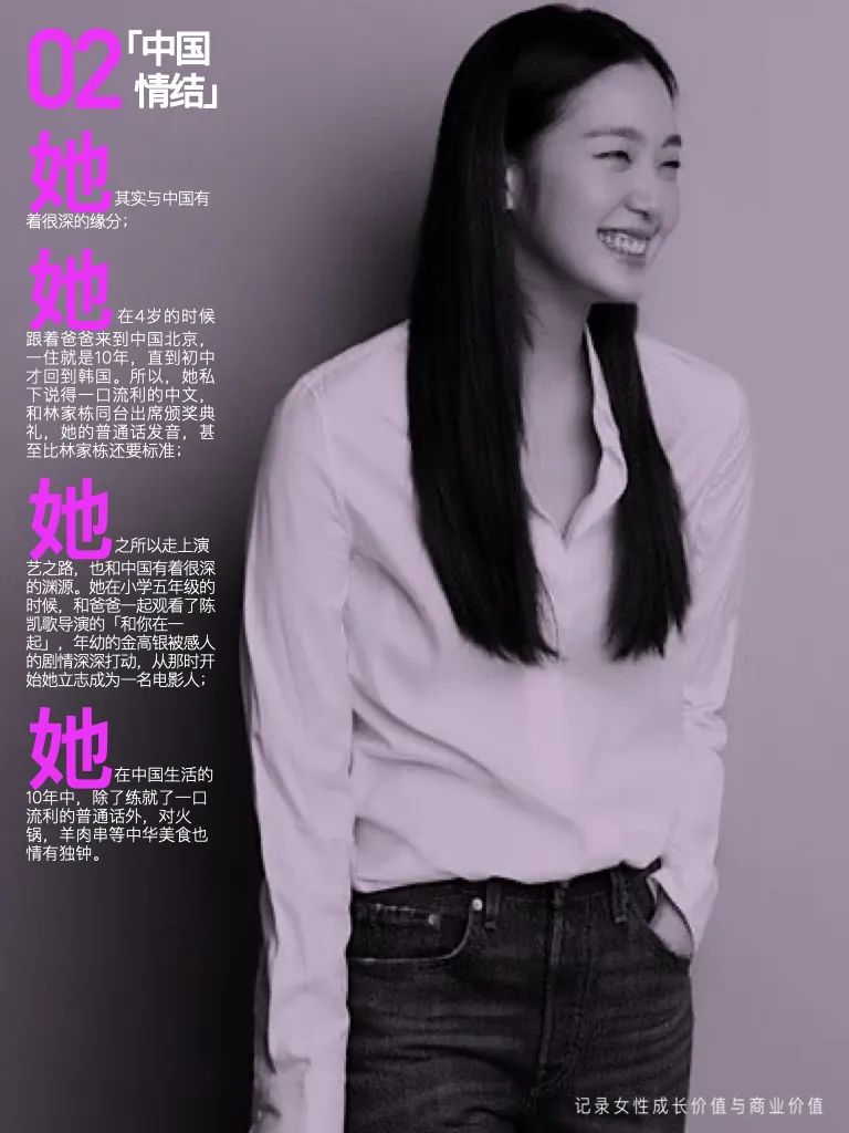 她之所以走上演艺之路,也和中国有着很深的渊源。她在小学五年级的时候,和爸爸一起观看了陈凯歌导演的「和你在一起」,年幼的金高银被感人的剧情深深打动,从那时开始她立志成为一名电影人;