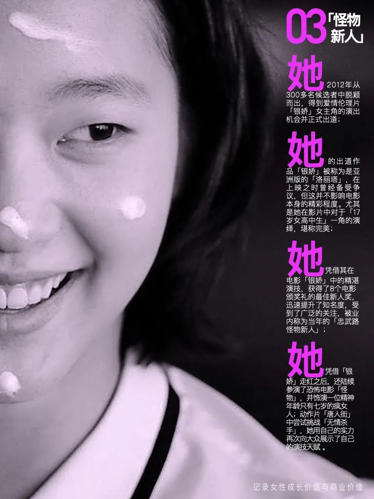 她,2012年从300多名候选者中脱颖而出,得到爱情伦理片「银娇」女主角的演出机会并正式出道;