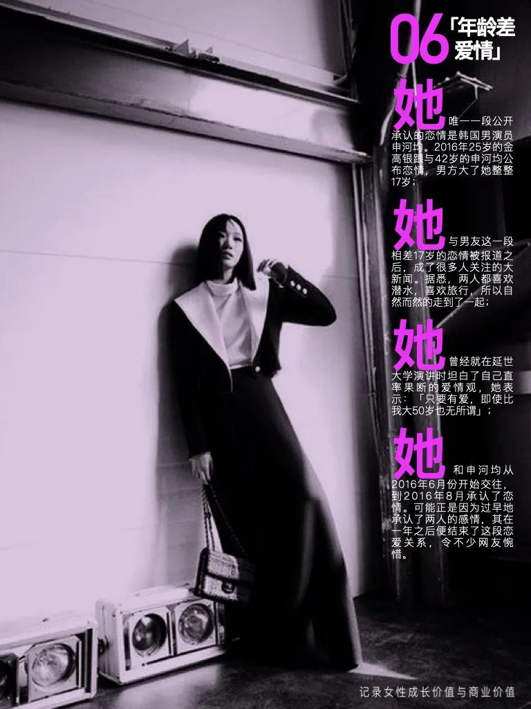 她唯一一段公开承认的恋情是韩国男演员申河均。2016年25岁的金高银跟与42岁的申河均公布恋情,男方大了她整整17岁;