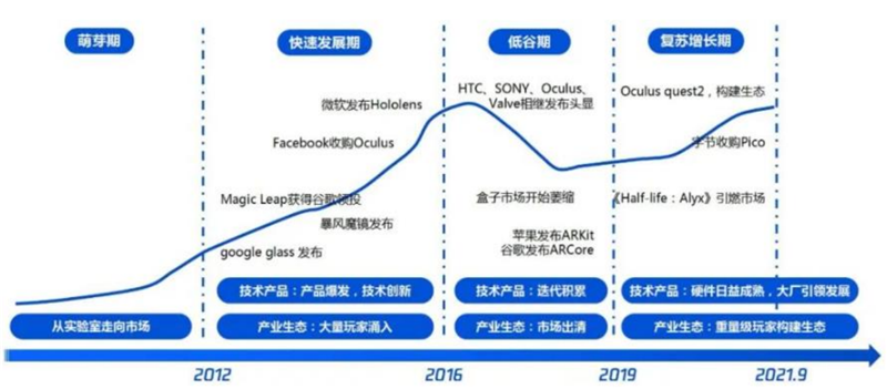 目前,VR/AR迎来了实质性的复苏发展阶段。2021-2022是VR/AR产业复苏的关键时间段。从虚拟现实生态角度,近两年有几个标志性事件: