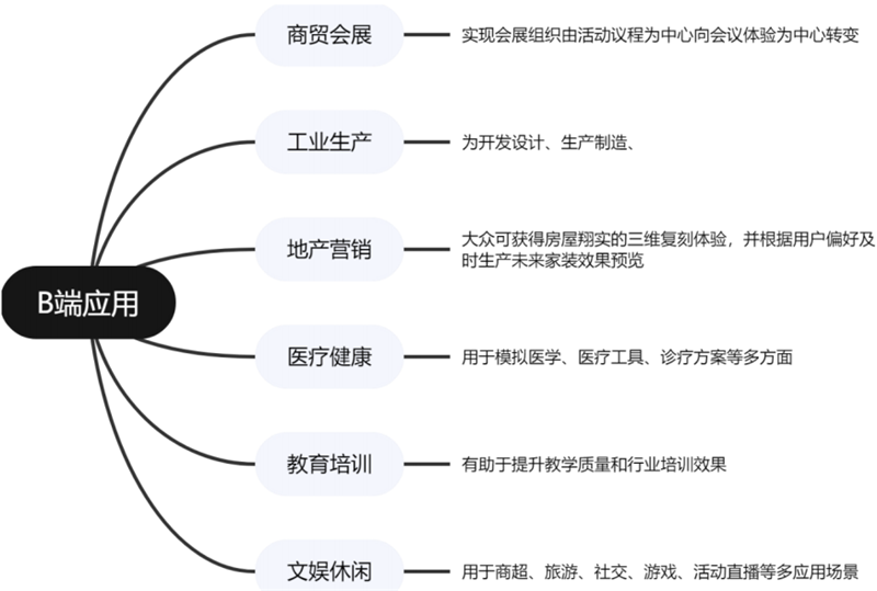 VR/AR产业链及市场格局:B端市场空间不容忽视,专业化深耕是核心。从VR/AR的应用端市场来看,未来几年C端消费级市场的高增确定性较强,B端市场也不容忽视。2020年B端企业级市场空间占比48%(消费者市场占比约52%),工业制造和教育的应用级市场具有爆发潜力,根据艾媒咨询,2025年工业制造和教育的市场规模有望达335.5/291.92亿,2030年有望达564.14/490.43亿。