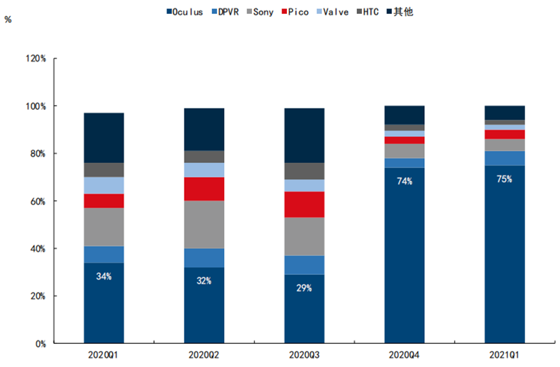 Meta的Oculus系列产品在VR市占率已超9O%(22Q1)。Oculus Quest 2以性能、低价、舒适度、内容等迅速打开市场——从2014年7月的Oculus Rift至2020年10月最新款OculusQuest 2的产品发布,Oculus的市场占有率从20年不足30%提升至22Q1的90%,2021年Oculus平均市占率约为80%。