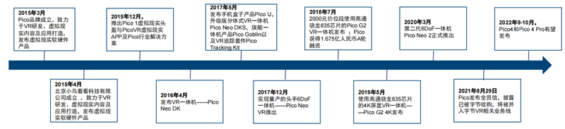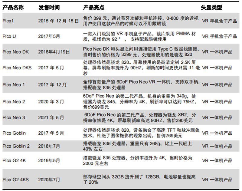 Pico是专注于硬件的VR企业,2015年以来已推出手机盒子1个系列、一体机2个系列共计11款产品,2015年12月和2017年5月曾推出两款手机盒子产品 Pico1和 Pico U,VR一体机产品包括NEO系列和小怪兽G系列,目前最新产品是Pico Neo 3 VR一体机,相比Neo2,Neo3价格亲民、性能提升,是市面上消费级产品中性价比较高的一款。