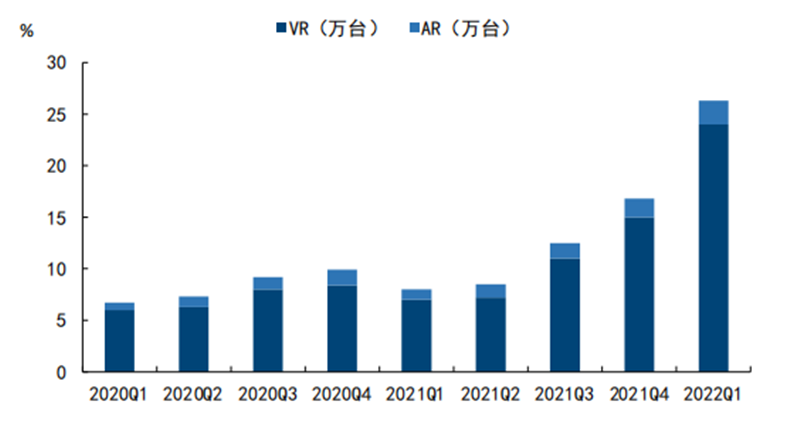 2021年中国VR/AR出货量(不含盒子)约46万台,同增38%,22Q1中国VR头显(不含盒子)出货25.7万台,同比增长14.8%。
